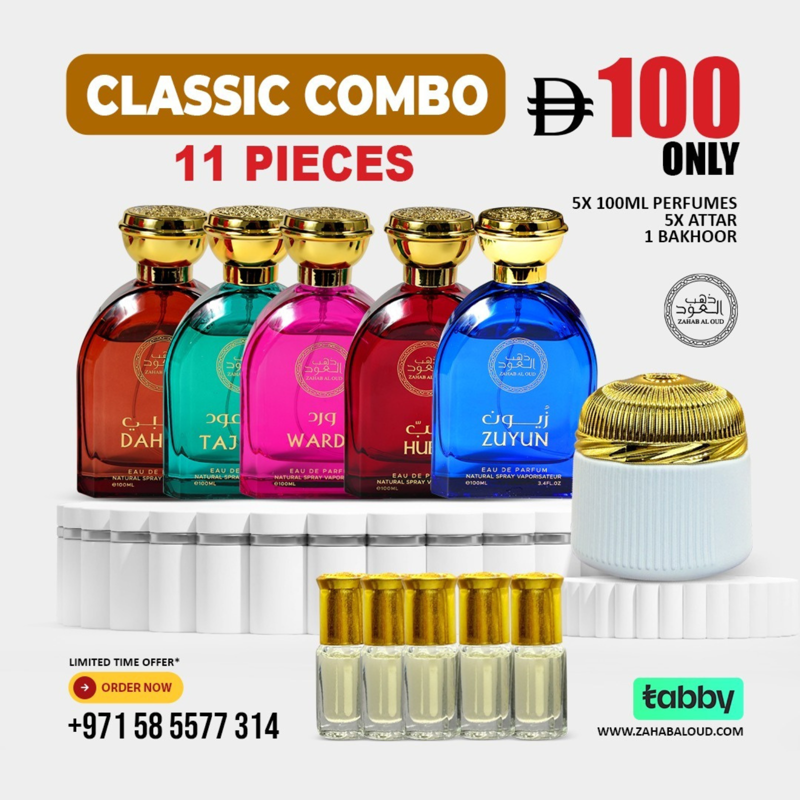 The Classic Combo is the perfect introduction to Zahab Al Oud’s world of luxury. This 11-piece set includes 5 magnificent 100ML perfumes, 5 rich attars, and 1 traditional bakhoor, offering excellent variety at a great value. Ideal for first-time buyers or those looking to expand their fragrance collection with trusted classics.